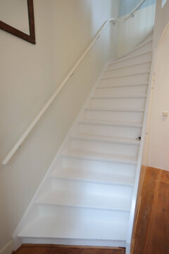 Via de volgende witte trap bereikt de tweede verdieping met 2 ruime slaapkamers en de badkamer. De slaapkamer aan de voorzijde (ca. 17m2) heeft een prachtig balkenplafond, een ingebouwde kastenwand en een knusse dakkapel met uitzicht over de charmante straat en de brug aan de Vliet. De tweede slaapkamer (ca. 11m2) aan de achterzijde gelegen, met een hoog plafond (schuinlopend), heeft eveneens een grote kast voorzien van spiegeldeuren. De twee openslaande ramen bieden uitzicht over het dakterras en de achtergelegen huizen. De moderne badkamer is voorzien van een hangend toilet, een doucheruimte en een vierkante wastafel.