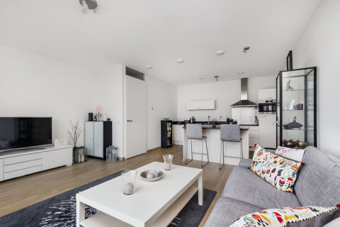 Op de begane grond van het complex bevindt zich de gezamenlijke entree met toegang tot de brievenbussen, bergingen, trappenhuis en lift. Aangekomen op de vijfde verdieping, komt u binnen in de hal met toilet, moderne meterkast, kast met aansluiting voor stadsverwarming en een handige extra gangkast. De hal biedt toegang tot alle vertrekken. De twee slaapkamers (290x490 en 220x380) en de ruime L-vormige woonkamer met open keuken hebben alle drie een glazen schuifpui tot aan de grond en grenzen aan het zonnige balkon op het Zuiden. Door de glazen schuifpui voelen de ruimtes zeer licht en ruimtelijk aan. De moderne keuken met kookeiland is voorzien van koel-/vriescombinatie, kookplaat, afzuigkap, oven en vaatwasmachine. De badkamer is betegeld met antracietkleurige vloertegels en witte wand betegeling. De badkamer is voorzien van een goede zeer ruimte inloopdouche, wasmeubel met wasbak en kraan en wasmachine en droger. De woning is opgeleverd in 2016, geheel volgens de nieuwbouwnormen gebouwd, met hoge deurposten, volledig geïsoleerd en verwarming en warm water via het stadsverwarmingsnet.