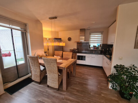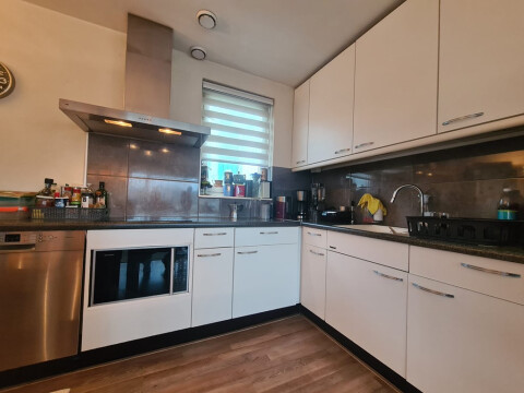 Entree woning. Binnenkomst in de ruime hal met toilet en fonteintje, praktische bergruimte (met de wasmachineaansluiting, stadsverwarming- en mechanische ventilatie-unit) en toegang tot alle vertrekken. De badkamer beschikt over een extra ruime inloopdouche met een vaste, glazen wand, stortdouche en aparte handdouche, een breed wastafelmeubel met praktische laden en bijpassende spiegel. Verder is deze ruimte afgewerkt met fraai tegelwerk in een neutrale kleurstelling, is het plafond verlaagd, voorzien van inbouwspots en een designradiator. De twee slaapkamers zijn gelegen aan de achterzijde van woning waardoor u vanuit beide kamers kunt genieten van het uitzicht. Ook de woonkamer met aangrenzend een zonnig balkon biedt u dit uitzicht. De woonkamer is heerlijk licht door het grote raam en net als de slaapkamers en hal voorzien van een laminaatvloer. Open keuken voorzien van diverse (inbouw)apparatuur zoals een combimagnetron, keramische kookplaat (geen gasmeter aanwezig), afzuigkap, stoere Amerikaanse koelkast en voldoende opbergruimte.