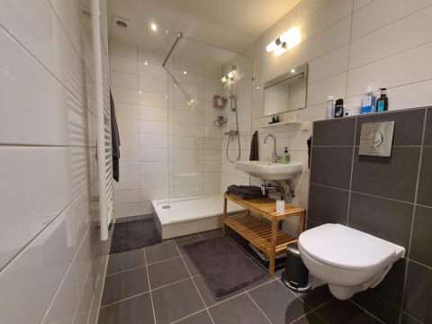 Entree op de begane grond, via de vaste trappen bevindt de voordeur van het appartement zich op de eerste verdieping. Entree in de hal welk in open verbinding staat met de woonkamer, direct bij de voordeur bevindt zich de badkamer welk luxe is afgewerkt en is voorzien van een inloopdouche, een wastafel met mengkraan, een handdoekenradiator en zwevend toilet. Tevens bevindt de aansluiting voor de wasmachine zich in de hal in een daarvoor bestemde kast.
