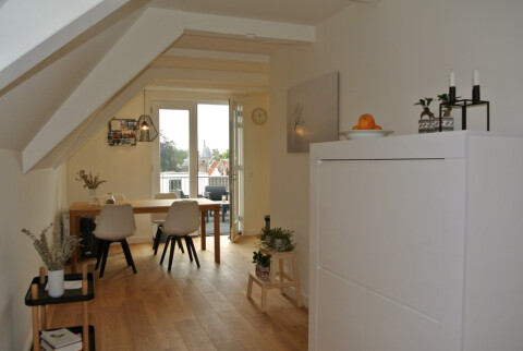 De woonkamer is ruim opgezet en voelt erg karakteristiek aan door het uitzicht welk het aan de voorzijde van het pand biedt op de Breestraat. De keuken staat eveneens in open verbinding met de woonkamer en is voorzien van een Koelkast, inductiekookplaat, afzuigkap, vaatwasser en combi-oven/magnetron.